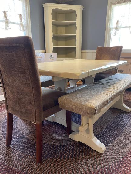 Items include: home decor, pub table with captain chair, TV stand, refinished/distressed pine corner cabinet, refinished/distressed pine table with 2 padded benches & 2 end chairs, bedroom dresser with large detachable mirror, platform 6 drawer storage Queen sleigh bed, bar decor, and MORE!