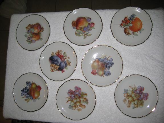 Set of 8 German dessert plates. Each has a different fruit theme and all plates are edge trimmed in gold. The orange fruit plate was cracked (broken) in two pieces by a grandson. This plate was repaired with epoxied and has held together over the past three years.