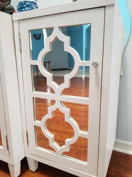 Beautiful and unique mirrored door console cabinet and two accent end tables. Interior storage on each. 3 pieces total. Can be displayed together or separately. Beautiful antique white washed color.
