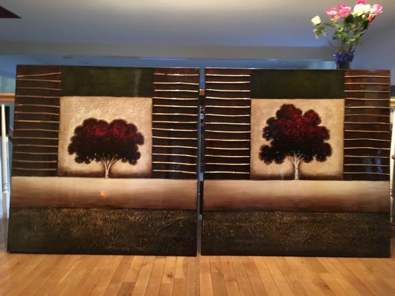2-piece wall hanging. stretched canvas. 40"x40"x1.5" wide. Raised sections. Very light. Can be hung side by side; get tired of that, hang one above the other! Red tree in middle of each, gold "straws' on edges. Will not separate. Thanks!