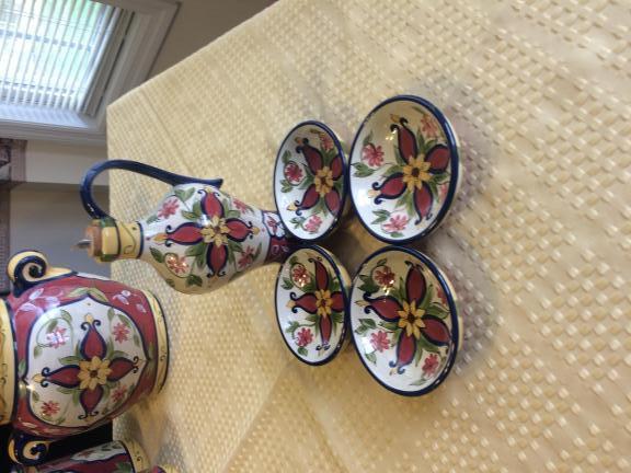 Large collection includes: 6 cereal bowls, 6 soup/pasta bowls, 2 small Canisters w/lids, 2 large canisters w/lids, Large cookie jar w/lid, 5 salad plates, 6 cereal bowls, 6 10" dinner plates (red), 6 mugs, 13" square serving platter, 6 13" Chop Plates/Chargers, 14" pasta/salad serving bowl, 1 oil jar w/drizzler & 4 dipping bowls, 16" Oval Serving Platter. Note: Red dinner plates and Cereal bowls have a few chips (see photos)