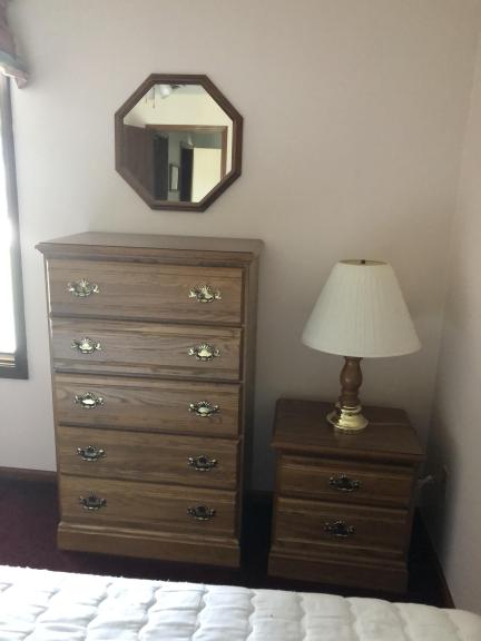 Full or Queen Size [Shown here as full.] Chest of Drawers, Night Stand, Mirror, Lamp, TV Stand.