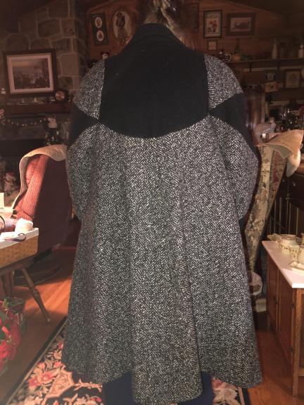 100% wool cape/coat black and white (salt and pepper) with black patches on arms, across shoulders and a black interior, Size LARGE. Made by Forstmann. Excellent condition, like new.