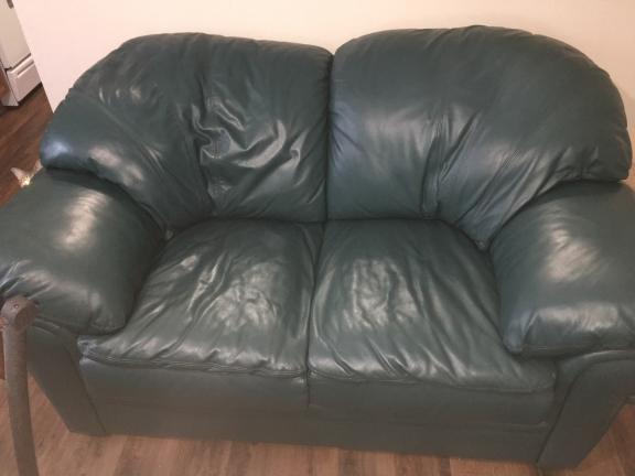 Over-sized cushions, comfy, forest green, leather love seat. Huntington- good condition