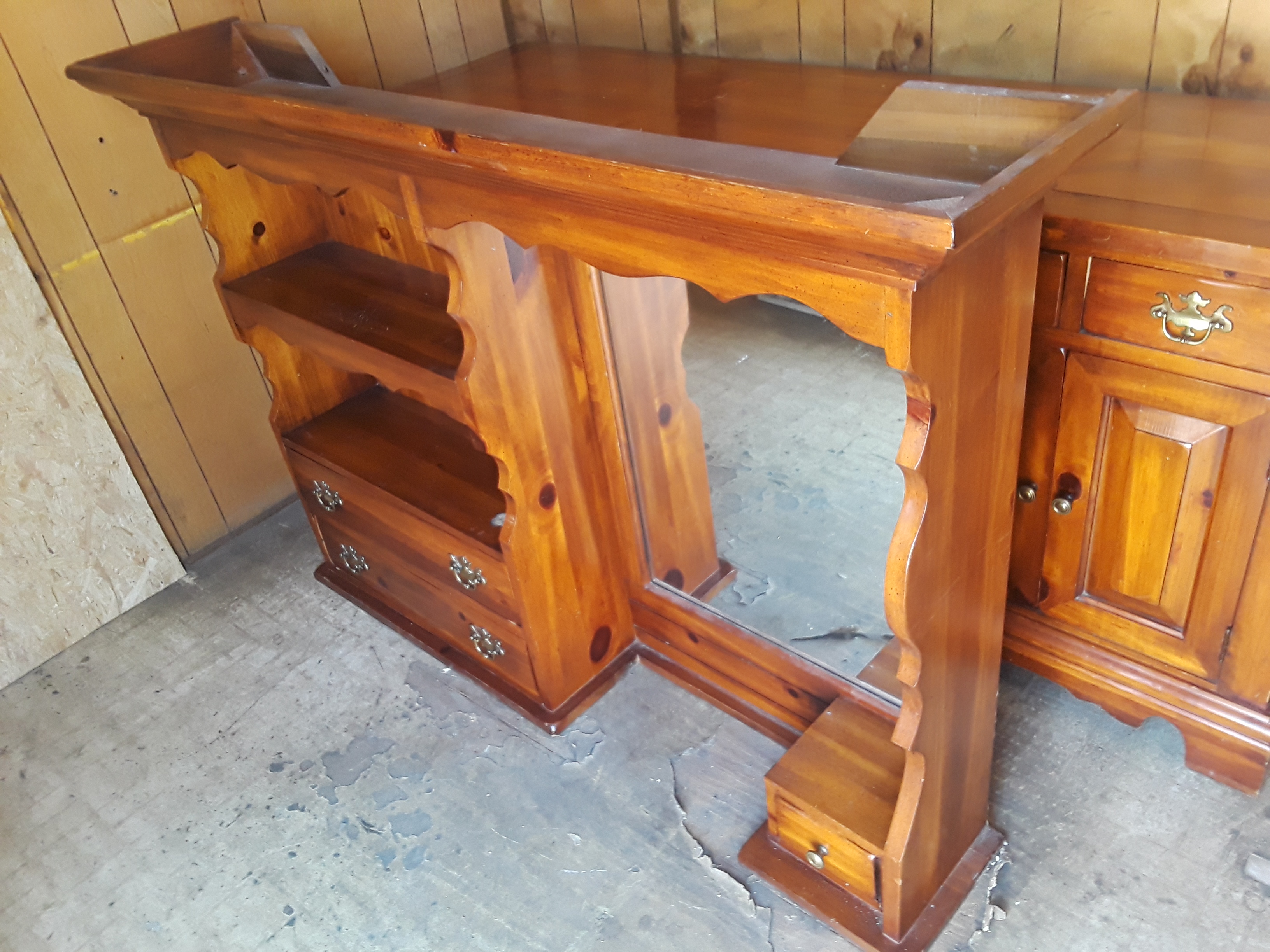 Top piece sits on top of the bottom 54 inch long 41inch tall 113/4 inch deep mirror 21X49 has 2 shelves 2med drawers and 1 small drawer all solid pine