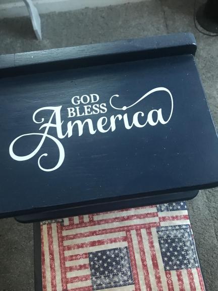 I have an up cycled bench for sale all new paint and fabric seat! God Bless America on top ! Very sturdy table / bench many uses. If interested please email me or text me. Measures Approx 26 inch long 29 inch high seat measures about 16 inch wide . Asking $40 let me know if interested ( I have more photos if you would like .
